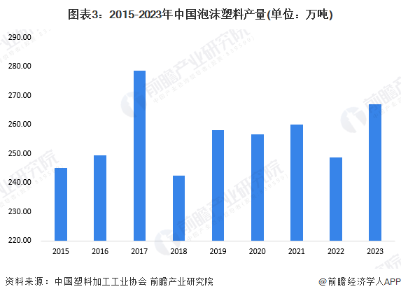 2015-2023年,我國泡沫塑料產(chǎn)量波動較大。2023年,我國泡沫塑料產(chǎn)量為266.90萬噸,較2022年增長6.1%。其中,廣東省、浙江省、江蘇省、福建省和河南省產(chǎn)量排在全國前五名。